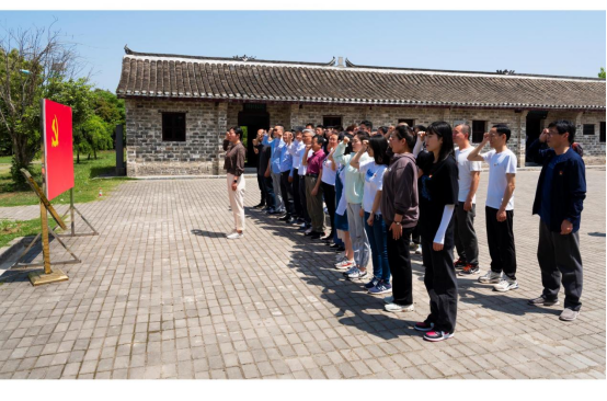 参观学习中,全体师生党员整齐列队,举起右拳庄严宣誓,重温入党誓词。