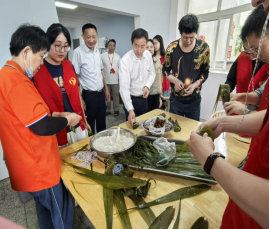 粽叶传情——包粽子迎端午。党员及入党积极分子分组协作,在康养家园工作人员的指导下,熟练地拿起粽叶、填入糯米、包裹捆扎。现场粽叶翻飞、糯米飘香,青年们一边请教包粽子的技巧,一边学习传统端午习俗,一个个裹着清香、充满爱意的粽子在手中成型。随后,志愿者们将包好的粽子送到老人手中,提前送上节日的祝福,让老人们感受到传统文化的温暖和集体关怀。