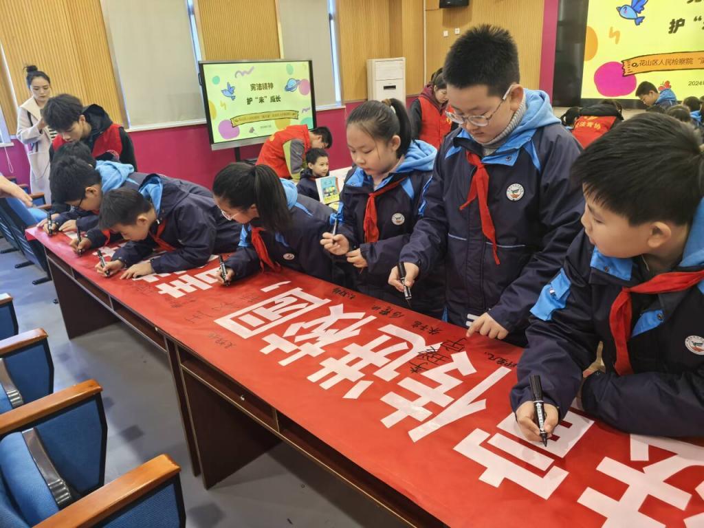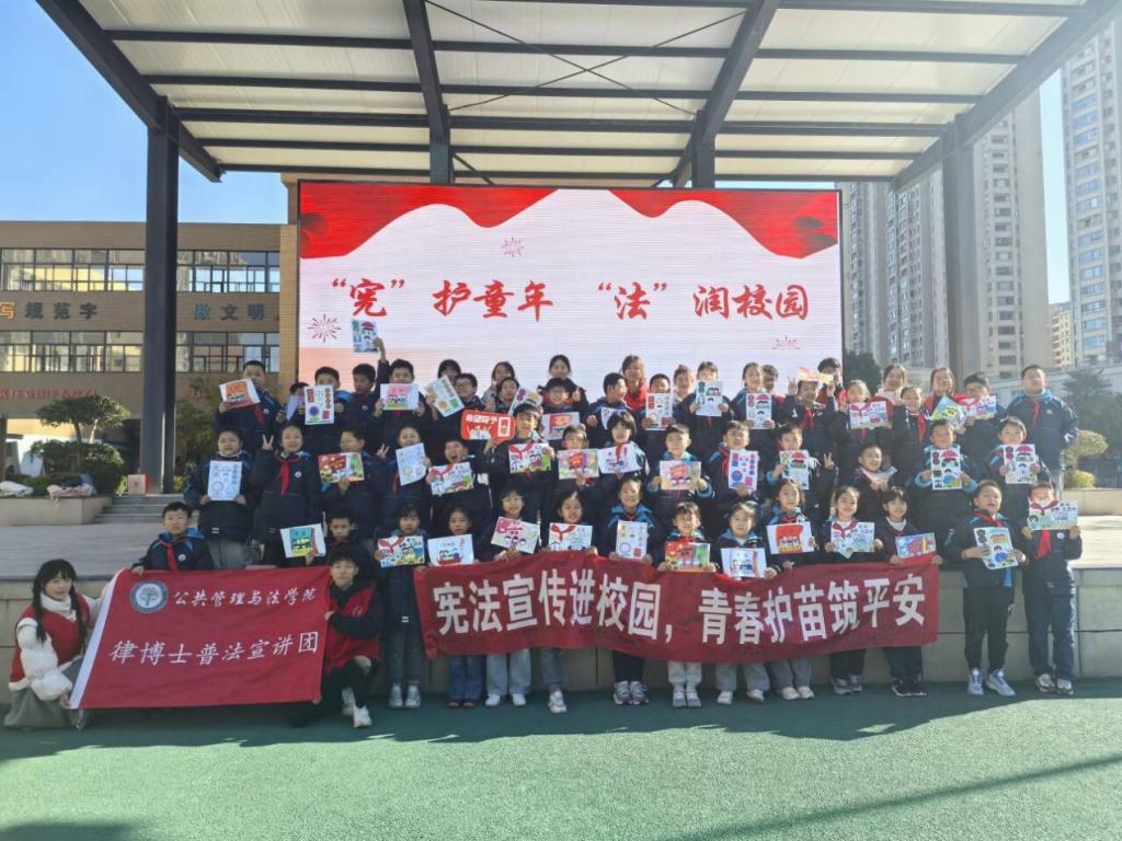 在东方城小学,团市委、花山区检察院、团花山区委、英国365集团官网联合开展了“‘宪’护童年 ‘法’润校园”主题活动,为孩子们精心准备了一堂内容丰富且寓意深刻的法治教育课。活动期间,公法学子积极响应号召,踊跃报名,通过现场互动与主题绘画涂色的形式,助力孩子们更好地接受宪法教育,进一步激发了同学们的参与热情。