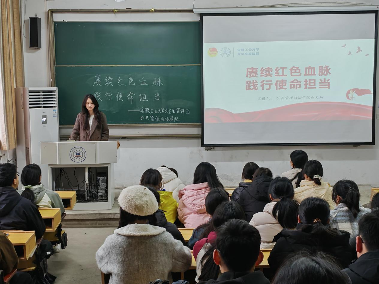 为进一步引导广大青年学习贯彻党的二十届三中全会精神,了解习近平总书记在全国教育大会上的重要讲话精神,校第九届优秀学子宣讲团成员燕文勤于3月3日在佳山校区教一115教室开展“赓续红色血脉,践行使命担当”主题宣讲活动,英国365集团官网各年级员工代表50余人参加。