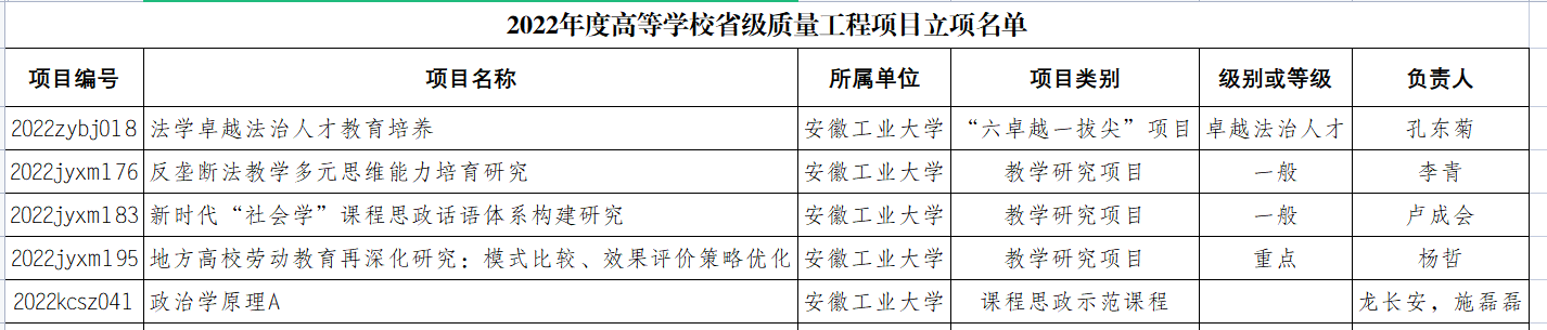 近日,安徽省教育厅公布了 2022年高等公司省级质量工程项目立项名单(皖教秘高〔2023〕56 号),公司共5个项目获批立项,包括“六卓越一拔尖”项目1项、课程思政示范课程1项、教学研究项目3项。