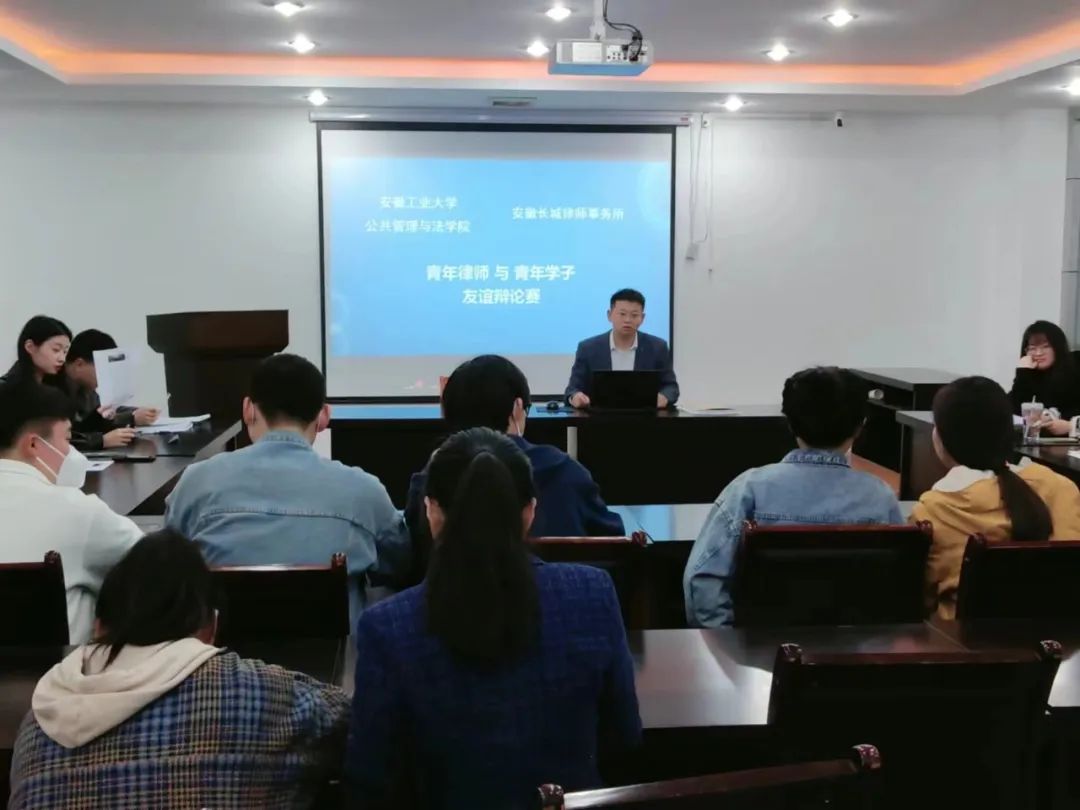安徽长城律师事务所为了加强公司法学系毕业实习生与青年律师的交流,搭建相互学习、促进的平台,2023年4月14日下午,举办“青年律师与青年学子友谊辩论赛”。此次辩论赛以真实案例为辩题,贴合实际,旨在提升辩手的思辨水平和业务能力,安工大学子及安徽长城律师事务所律师近30人参加了此次活动。