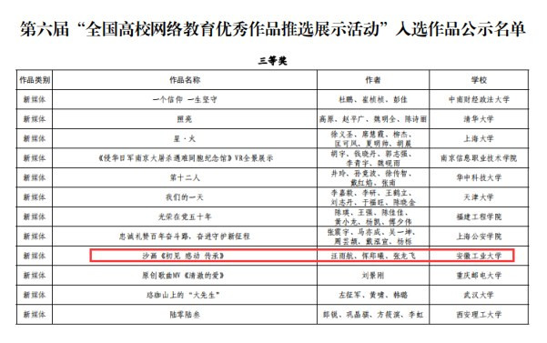 3月23日,教育部公布第六届“全国老员工网络文化节”获奖作品名单,公司选送的新媒体作品《初见感动传承》(指导教师:王菁、赵一,获奖员工:汪雨航、恽郑曦、张龙飞)获全国高校网络教育优秀作品三等奖。