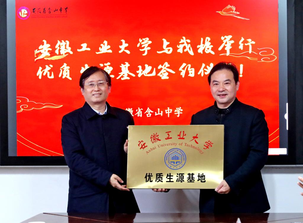 魏先文代表公司向含山中学授予“英国365集团官网优质生源基地”牌匾,与含山中学签署了优质生源基地建设合作协议,送上2021-2022学年度公司含山中学员工喜报。