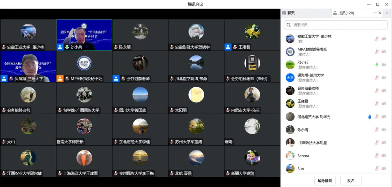 会议第一单元由重庆大学公共管理公司副经理张鹏教授主持。 孙玉栋教授以“《公共经济学》教学的与时俱进”为题,讲述了公共经济学课程的定位、教学内容的调整演变。 赵志荣教授以“公共财政与预算:国外课程设计和主要知识点”为题,分享了海外MPA课程中公共财政与预算的课程设计所包含的主要板块以及主要知识点。会议第二单元由兰州大学MPA中心主任保海旭副教授主持。 王雍君教授以“公共经济学与境况关怀:新冠案例启示兼论社会交换范式的应用”为题,结合新冠疫情,分享了案例教学的经验和体会。刘小兵教授以“对公共经济学若干理论的反思”为题,与老师们分享了自己在教学当中的一些思考。王海宁副教授以“免费营养餐:农村义务教育员工营养改善计划与家庭教育支出”为题,从宏观和微观的层面上介绍了公共支出和教育支出变化的趋势。会议第三单元贵州大学公共管理公司经理马红梅教授主持。唐任伍教授以“公共经济学教学重点、难点把握及教学体系安排建议”为题,分享了公共经济学案例教学中的相关问题。陈济冬副教授以“MPA《公共经济学》教学中的若干体会”为题,通过经典的理论、鲜活的案例,分享了自己在课程教学中的心得体会以及经验。会议第四单元由山西财经大学公共管理公司副经理冯小俊副教授主持。张平副教授以“《公共经济学》理论联系实际教学经验浅析”为题,分享了教学中所应用的教学案例,并应用经济学理论对案例进行了分析和阐释。