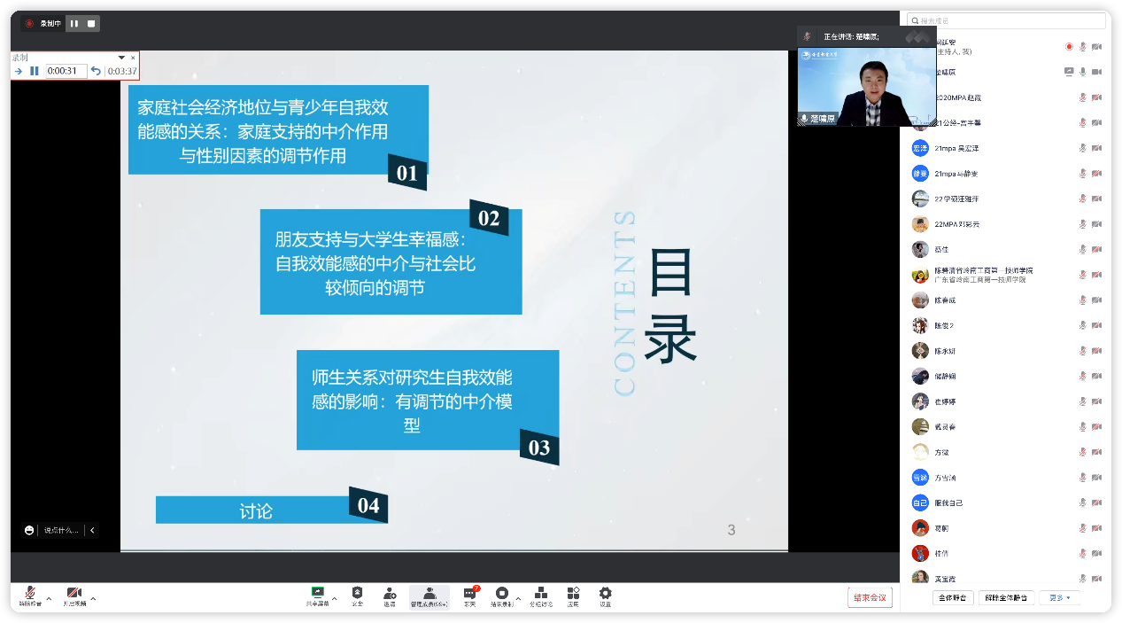 报告开始前,问老师对楚老师的到来表示热烈欢迎并简要介绍楚老师的基本情况。楚老师通过自己的三篇高水平论文展开报告内容,分别是《家庭社会经济地位与青少年自我效能感的关系:家庭支持的中介作用与性别因素的调节作用》、《朋友支持与老员工幸福感:自我效能感的中介与社会比较倾向的调节》和《师生关系对研究生自我效能感的影响:有调节的中介模型》。他从研究的理论基础切入,帮助同学们理解研究变量之间的关系,亦为同学们后续的论文写作拓宽了思路。