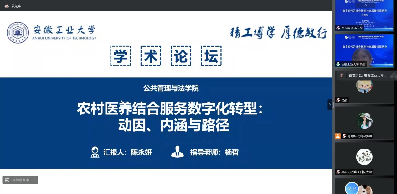 2022年8月26日,南京邮电大学社会与人口公司、济南大学政法公司、杭州电子科技大学社会学系共同承办的“中国社会学会2022年学术年会论坛55——数字时代的社会转型与高质量发展研究”以线上形式隆重开幕。南京大学社会公司经理成伯清教授致开幕辞,南京邮电大学研究员沙勇发表主旨发言。公司杨哲老师以及公共经济管理硕士研究生陈永妍、MPA研究生王佩佩参加此论坛。