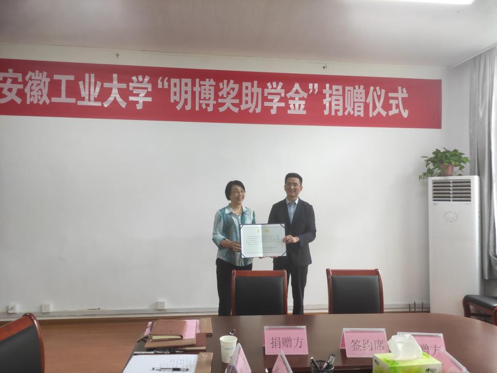 捐赠仪式上,安徽明博律师事务所管理委员会执行主任李阳、员工工作处(教育发展基金会秘书处)处长甘亚代表捐赠方和受赠方签订了捐赠协议,顾明言代表公司教育发展基金会向安徽明博律师事务所颁发了捐赠证书。