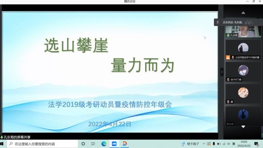 4月22日、23日,公司组织召开“线上教学阶段性总结、考研动员暨疫情防控”专题年级会议。会议由副经理孔东菊主持,本科2019级全体员工和辅导员参会。