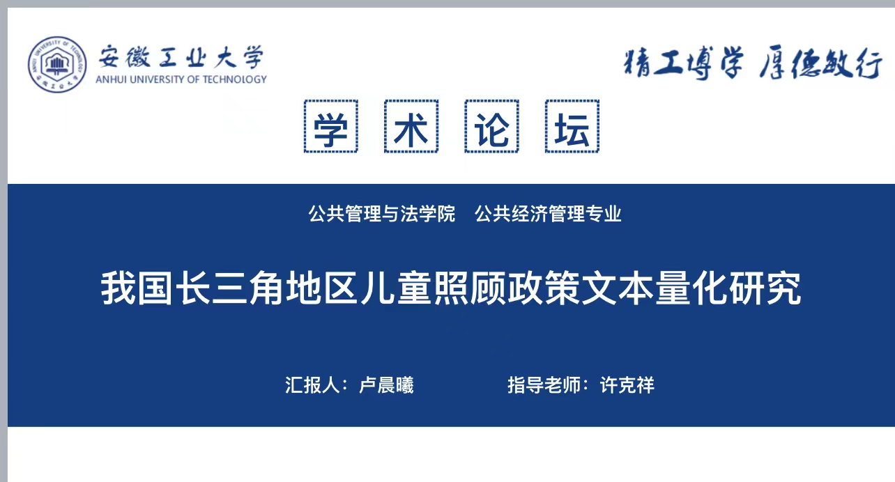 本次论坛流程如下:先由汇报人分享论文结构及内容,再由三位老师依次进行点评,最后进入同学们的疑问解答互动环节。三位汇报人均为2020级公共经济管理专业的研究生,第一位汇报人是朱俊同学,汇报主题为“SIPS模式下三农短视频助推农村产业发展策略研究”。他结合社交媒体时代,引入SIPS用户消费行为模型,并对当前农村产业发展瓶颈和短视频的助推策略进行了介绍,老师从内容表述和整体框架对他的论文提出了针对性的意见。第二位汇报人是方雪涵同学,汇报主题是“老年友好社区发展困境及纾解路径”。在老龄化日益严重的背景下,她引入较为新颖的研究对象即“老年友好社区”,力图提升社区居家养老的幸福感,老师分别从微观和宏观角度提出了修改建议。第三位汇报人是卢晨曦同学,汇报主题是“我国长三角地区儿童照顾政策文本量化研究”。儿童照顾问题几乎与每个家庭都紧密相关,她通过对政策文本进行分析发现了不足之处,有利于针对现实问题提出具体建议,老师针对地域选择、参考文献等方面提出了问题并给出对应的修改建议。