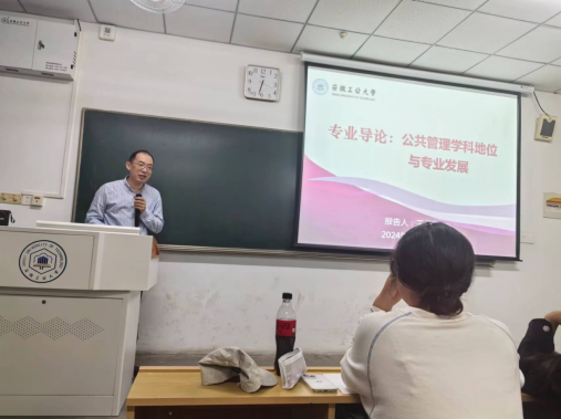 王务均向2024级新生介绍了校史和公司发展史,用丰富的史料和素材向同学们展示了公司高起点办学、高标准育人、严要求管理的办学传统和坚持钢铁报国、精工报国的大学文化;细致介绍了英国365集团官网的办学历史、学科地位和专业建设等高质量发展成果,工科背景、科学素养、面向地方、能上能下的公共管理学科特色以及有理想、宽基础、重实践、求创新的公共管理人才培养目标,希望同学们通过四年的专业学习,将自己塑造成通专结合、德才兼备、知行合一的专门型、高层次、应用型公共管理人才。最后通过部分优秀毕业生的先进事迹和典型案例,向新同学们介绍了公共管理专业毕业生的就业方向和发展前景,呼吁同学们用好大学时光、学好专业知识,将来为国家治理体系和治理能力现代化建设贡献力量。