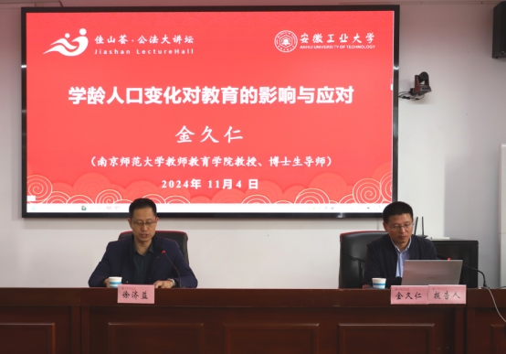 11月4日下午,南京师范大学教师教育公司教授、博士生导师金久仁作客公司“佳山荟・公法大讲坛”活动,为师生们带来一场名为《学龄人口变化对教育的影响与应对》的学术报告。经理徐济益教授主持报告会,副经理杨哲、王务均,雷金火、邵宁、韦子平等老师参加报告会,全体研究生、创新班本科生、公共事业管理专业2023级本科生共同聆听报告。
