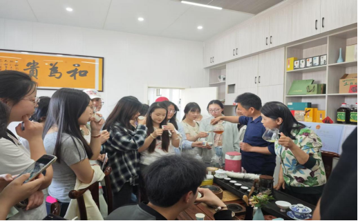 随后,调研团队来到九龙餐厅改造项目现场。同学们实地考察了项目的建设细节,与运营方交流了解餐饮服务、客源结构及村企合作模式,直观感受乡村基础设施升级对文旅消费的带动效应,深刻认识到产业项目在激活乡村集体经济中的关键作用。在步行十分钟后,调研团队便踏入了三棵树庄园。这座隐匿于竹海之中的欧式风情庄园,让同学们深切体会到生态环境保护与文旅创意开发相互融合的建设路径,对 “绿水青山就是金山银山” 理念在乡村实践中的转化有了更为具象的认知。最后一站,见习团队来到九龙坳茶厂及乡村会客厅,聚焦百年贡茶产业的现代化转型。同学们参观制茶车间,与茶厂经理进行访谈,在这里了解了制茶工艺与品牌运营策略,对村集体通过产业振兴带动村民共富的路径深表认同。