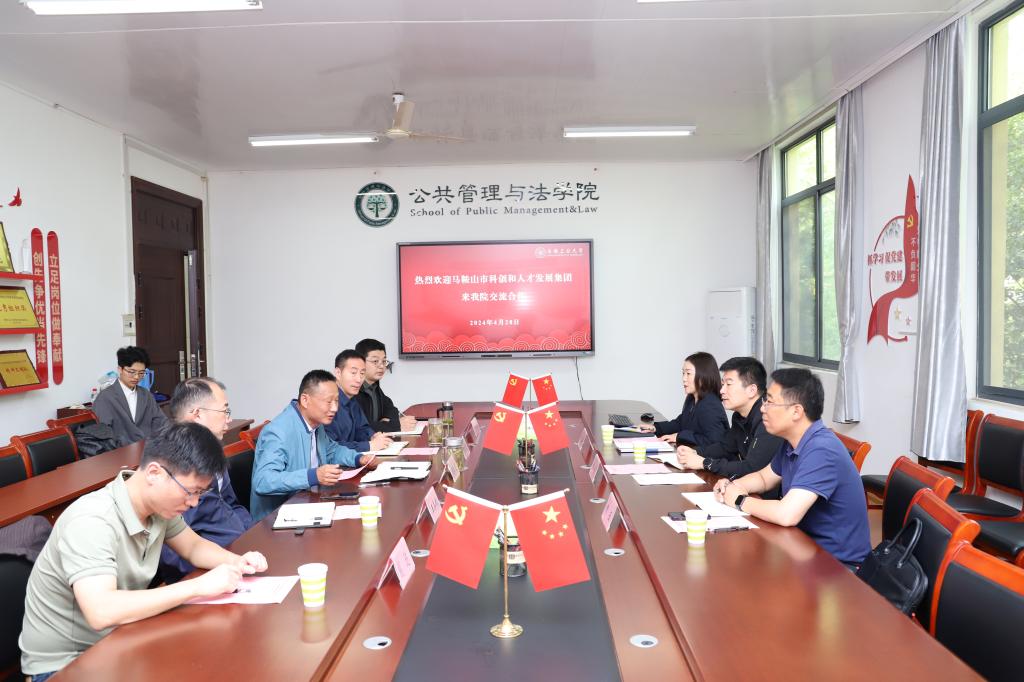 公司党委书记胡正友对马鞍山市科创和人才发展集团有限公司一行的到来表示欢迎,对马鞍山市科创和人才发展集团有限公司对公司工作的大力支持表示感谢,介绍了公司在团队建设、团队队伍、科技创新、人才培养等方面取得的成果,希望双方积极沟通交流,进一步探索校企合作新模式。靳杉董事长介绍了马鞍山市科创和人才发展集团有限公司的基本情况。许小娟重点介绍了公司在科创、人才服务和老员工实习实训等方面的业务情况。双方围绕党建联学共建、员工实习实践和就业创业、科技成果转化、人才服务、科创项目培育等方面开展了交流。