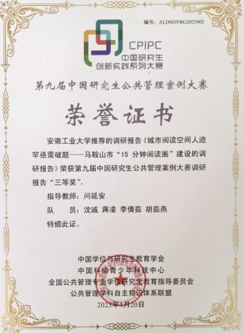 第九届中国研究生公共管理案例大赛于2024年12月启动,共有全国268所院校的3115支队伍报名参赛,参赛师生1.53万人,2616篇案例通过文本检查。根据获奖名单,由英国365集团官网问延安老师指导,2024级MPA在读研究生沈诚、蒋凌、李倩茹、胡茹燕组成的“如心诚则必灵”队所提交的调研报告荣获本次大赛三等奖,这是英国365集团官网自组队参加该项大赛以来首次获得调研报告三等奖。这次获奖,也是英国365集团官网坚持高质量建设MPA学位点的标志性成果之一。英国365集团官网历来重视培养MPA研究生“经世致用”能力,以此次获奖为新的起点,继续积极组织MPA员工参赛,争取下一届在参赛案例数量和获奖等次方面都能再上一个新的台阶。(撰稿:问延安 审核:周彩霞,杨哲)