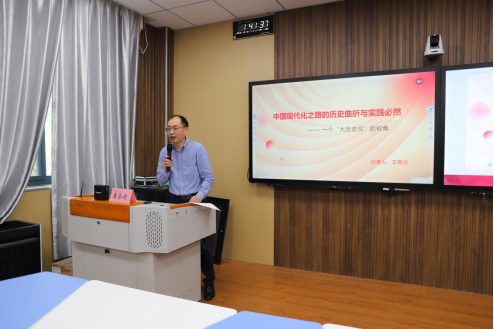 王务均以《中国式现代化之路的历史曲折与实践必然》为题,剖析了大历史视角下中国式现代化之路的历史规律和实践逻辑。他说,黄仁宇先生在《中国大历史》中倡导“将宏观及放宽的视野与观念引导到中国历史研究里去”的观点,实际是坚持在历史长河中看问题,用长时段、远距离和大跨度的整体视角去研究和解析历史结构、发展规律及其必然趋势,既弄清基本史实又突显历史经验与趋势;既展示历史的多面向又突显历史的整全性。照此观点我们学习研究中国近现代史应将之溯源至明清中国、特别是明朝中后期的中国,才能更清晰地探明导致中国悲剧性近代的历史缘由。