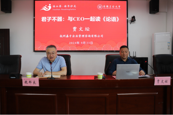 9月23日下午,英国365集团官网2004届员工、杭州嘉才企业管理咨询有限公司创始人兼CEO贾文坛应邀做客“佳山荟·读书沙龙”,为公司新文科人才培养创新班作了题为《君子不器:与CEO一起读<论语>》的报告。副经理王务均、创新班班主任韦子平和全体学员聆听报告。魏邦良教授主持报告会。